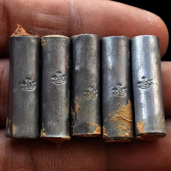 ชุด 5 ดอก...ตะกรุดทองพันชั่ง อุดผงมวลสาร ปี 2554 พระครูน้อย วัดชัยมงคล จ.สุพรรณบุรี พร้อมซองรูปใบฝอยเดิมจากวัด