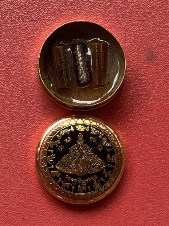 เคาะเดียวแดง สีผึ้งพระราหู รุ่น มงคลจักรวาล เนื้อ โลหะชุบทองลงยาสีดำขอบสีแดง ขนาด 3.2ซม |