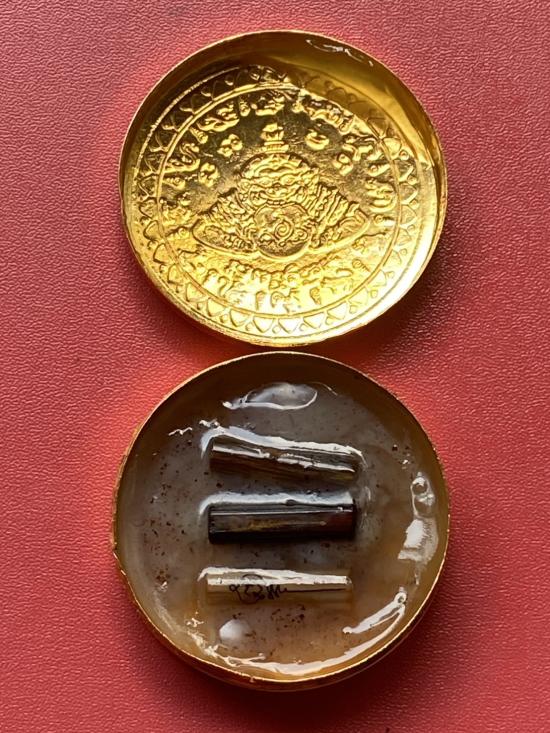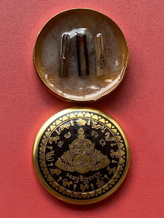เคาะเดียวแดง สีผึ้งพระราหู รุ่น มงคลจักรวาล เนื้อ โลหะชุบทองลงยาสีดำขอบสีดำ ขนาด 5ซม |