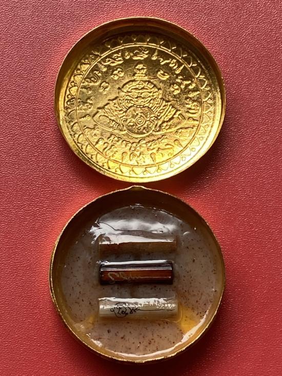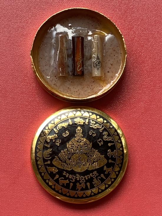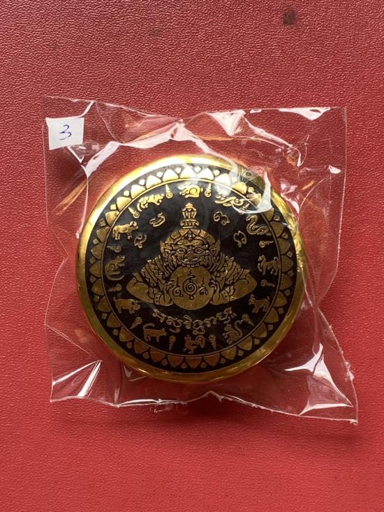 เคาะเดียวแดง สีผึ้งพระราหู รุ่น มงคลจักรวาล เนื้อ โลหะชุบทองลงยาสีดำขอบสีดำ ขนาด 5ซม |