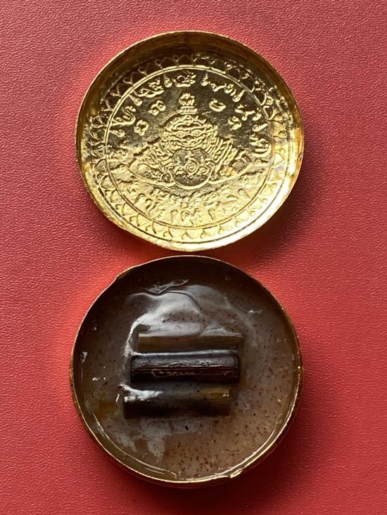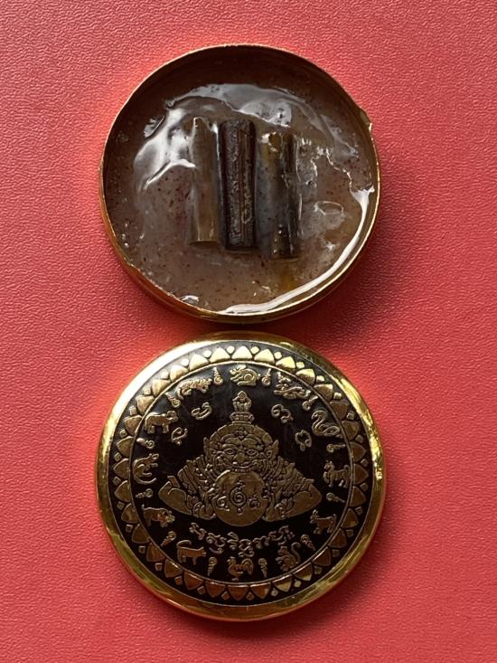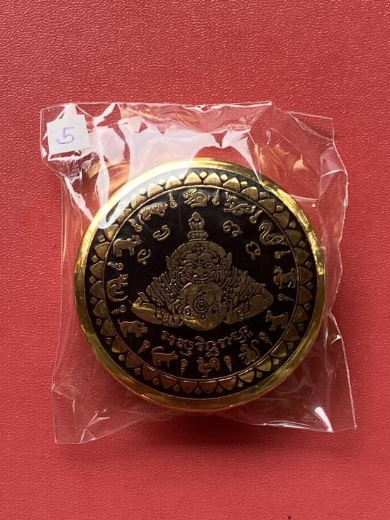 เคาะเดียวแดง สีผึ้งพระราหู รุ่น มงคลจักรวาล เนื้อ โลหะชุบทองลงยาสีดำขอบสีดำ ขนาด 5ซม |