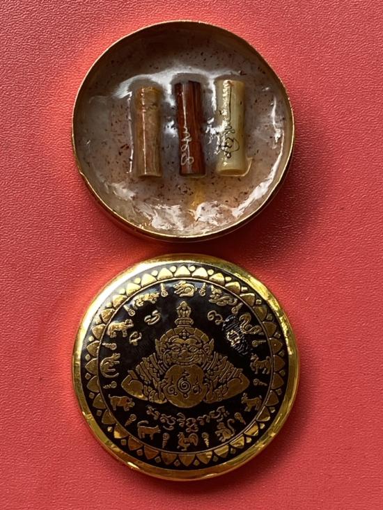 เคาะเดียวแดง สีผึ้งพระราหู รุ่น มงคลจักรวาล เนื้อ โลหะชุบทองลงยาสีดำขอบสีดำ ขนาด 5ซม |