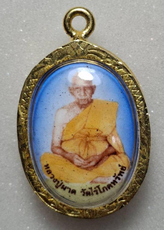 ด้านหน้าเป็นรูปหลวงปู่ผาดนั่งเต็มองค์ฉากสีฟ้า