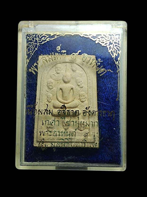 พระสมเด็จ 9 พระอรหันต์ เนื้อมวลสารผสม อัฐิธาตุ อังคารธาตุ เกศา และชานหมากของพระอรหันต์ 9 รูป มูลนิธิโลกทิพย์ สภาพสวย หายาก พร้อมกล่องเดิมๆ