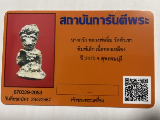 นางกวัก หลวงพ่ออิ่ม วัดหัวเขา พิมพ์เล็ก เนื้อทองเหลือง ปี2470 สุพรรณบุรี บัตรรับรอง