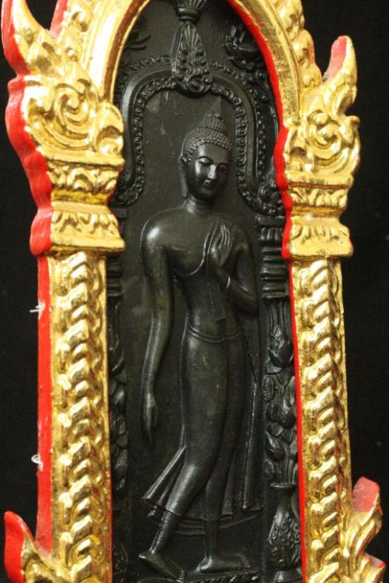 องค์นี้เป็นพระลีลากำแพงศอกของหลวงพ่อขอม วัดไผ่โรงวัวหรือชื่อวัดโพธาราม หล่อด้วยเนื้อตะกั่วเก่า ที่นำมาจากพระกำแพงศอกเนื้อตะกั่วเก่าที่หักจากกรุวัดพระศรีรัตนมหาธาตุจังหวัดสุพรรณบุรี จึงทำให้องค์พระมีมวลสารศักดิ์สิทธิ์เก่าเป็นองค์ประกอบในการจัดสร้าง สำหรับองค์นี้เป็นอีกหนึ่งพิมพ์นิยมเล่นหาเป็นมาตรฐานมานานแล้วครับที่เรียกว่าพิมพ์หลังพอจุด เป็นพระเนื้อตะกั่วเก่าที่ดูง่ายมากมาพร้อมซุ้มปิดทองพร้อมตั้งบูชา ถ้ายังไม่เคยมีไว้บูชาแนะนำครับว่าเป็นพระที่บูชาแล้วดี จะเจริญก้าวหน้าดั่งพิมพ์พระครับผม