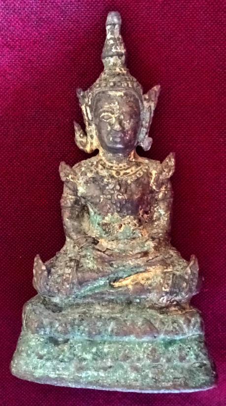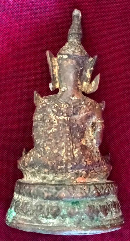 พระรัตนะ ทรงเครื่อง ปางตรัสรู้ (หายากกว่าปางมารวิชัย) หน้าตักประมาณ 1.6 นิ้ว รักทองประปราย เนื้อเก่ามากสนิมหยกขึ้นงดงามมาก หล่อหนา ใต้ฐานดินไทยเต็ม ๆ ฐานบัวคว่ำบัวหงาย ดูเก่าขลังมากครับ มีพระรัศมีบิ่นไปนิดครับ ส่งฟรีทั่วไทย รับประกันตามกฎครับ