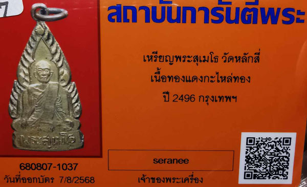 เหรียญพระสุเมโธ วัดหลักสี่ เนื้อทองแดงกะไหล่ทอง ห่วงเดิม ปี2496 จ.กรุงเทพฯ + บัตรG-pra สภาพเดิมค่ะ