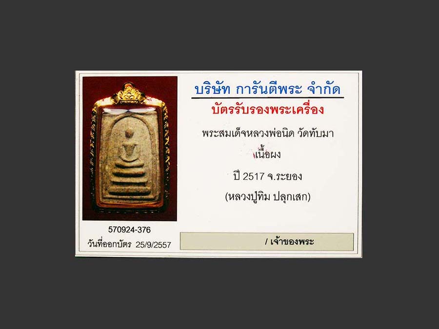 พระสมเด็จหลวงพ่อนิด วัดทับมา เนื้อผง ปี 2517 จ.ระยอง (หลวงปู่ทิมปลุกเสก) เลี่ยมทองแท้