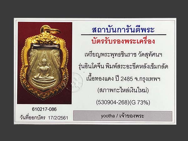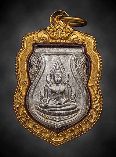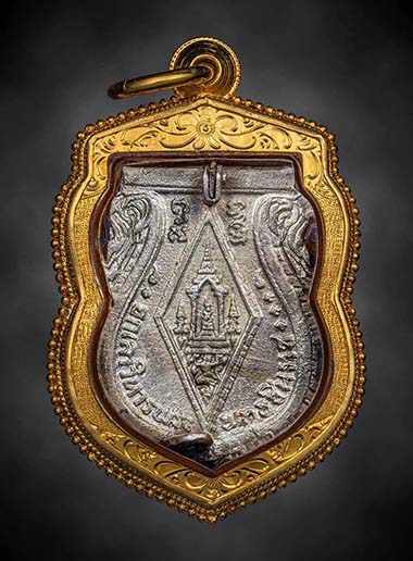 เหรียญพระพุทธชินราช วัดสุทัศนฯ รุ่นอินโดจีน พิมพ์สระอะขีดหลังเข็มกลัด เนื้อกะไหล่เงิน ปี 2485 จ.กรุงเทพฯ เลี่ยมทองแท้อย่างหนาพร้อมใช้