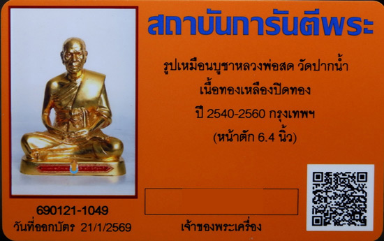 พระบูชา(ป้ายแดง) หลวงพ่อสด วัดปากน้ำ ภาษีเจริญ ธนบุรี หน้าตัก 6.4" พร้อมรับรองGPra