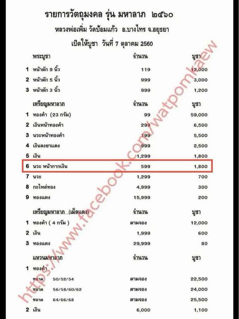 800.- เหรียญมหาลาภ ปี 60 หลวงพ่อเพิ่ม วัดป้อมแก้ว อยุธยา เนื้อนวะโลหะหน้ากากเงิน ราคาจองเท่าเนื้อเงิน 1,800 เลข no.515 จัดสร้างแค่ 599 เหรียญ น้อยมากๆ (น้อยกว่าเนื้อเงินลงยาแดงอีก) สวยเดิม คากล่อง