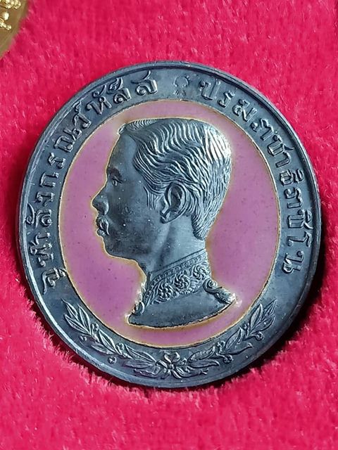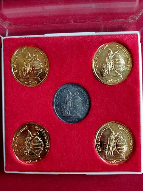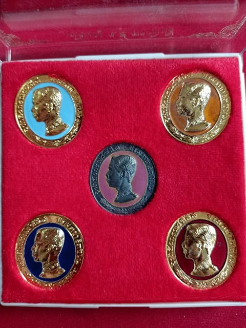 เหรียญรัชกาลที่ 5 ทรงยินดี สร้างโรงพยาบาลพานทอง จังหวัดชลบุรี ปี 35 ท่านเจ้าคุณธงชัย วัดไตรมิตร จัดสร้าง เนื้อกะไหล่ทองลงยา 4 องค์ เนื้อเงินลงยาสีชมพู 1 องค์ เคาะเดียวแดงครับ