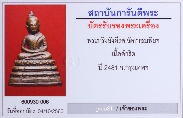 พระกริ่งพุทธอังคีรส วัดราชบพิตร เนื้อแดง อุดใหญ่นิยม ปี 2481 มาพร้อมบัตร G ครับ