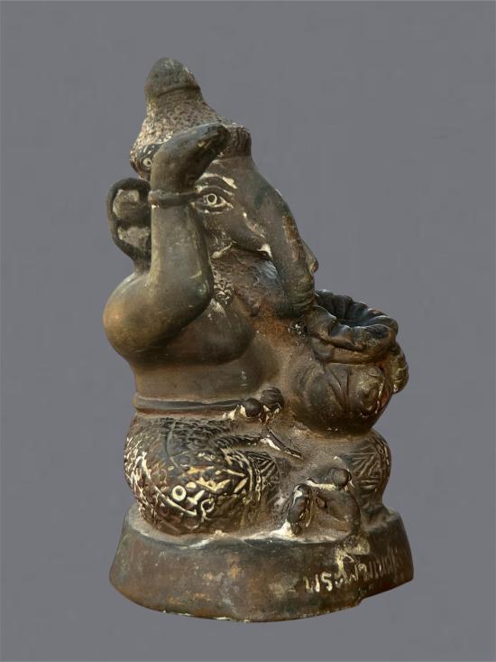 พระบูชาพระพิฆเนศ กวักมือถือถุงทรัพย์ ขนาด 3 นิ้ว หลวงพ่อแดง วัดป้อมรามัญ ก้นปิดแผ่น จารมือ