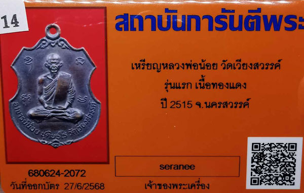 เหรียญหลวงพ่อน้อย วัดเวียงสวรรค์ รุ่นแรก เนื้อทองแดง ปี2515 จ.นครสวรรค์ + บัตรG-pra สภาพเดิมค่ะ
