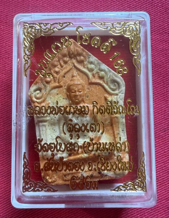 วัดใจไปเลย ขุนแผนโชคดี 168 ตุ๊ลงเต่า วัดอุโบสถ จ.เชียงใหม่ เนื้อผงพรายสีส้มลายหินอ่อน หลังปิดผ้าอาถรรพณ์ ฝังเหรียญโชคดี หมายเลข 5 |