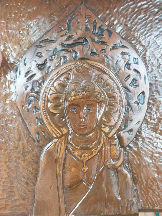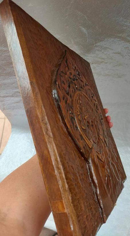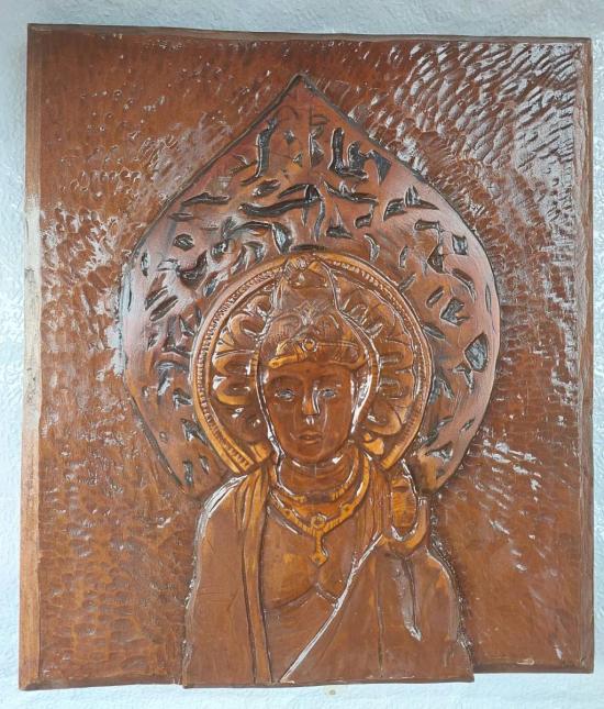 พระโพธิสัตว์ไม้เก่าแกะสลัก จากญี่ปุ่น เนื้อไม้ศักดิ์สิทธิ์ 12 X 14 นิ้ว หนา 1 นิ้ว