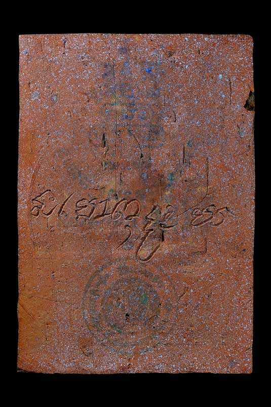 แผ่นสี่เหลี่ยมบูชารูปเหมือนนั่งบริกรรมคาถา ( 6 x 4 นิ้ว ) เนื้อดินเผาด่านเกวียน จัดสร้างโดย วัดแจ้งนอก พ.ศ.2536 ( หลังจารเปียก , ปั้มยันต์ , ปั้มตราวัดแจ้งนอก )