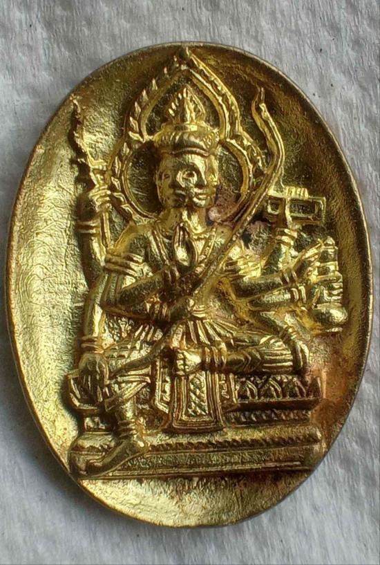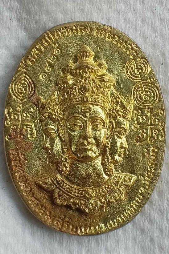 เหรียญหล่อท้าวมหาพรหมสุริยเทพ หลวงปู่กาหลง เขี้ยวแก้ว วัดเขาแหลม สระแก้ว รุ่น ครอบเศียรพระลักษณ์ ปี 2549 นวะโลหะพิเศษแก่ทองคำ ตอกโค๊ด หมายเลข ๑๔๒๑ จารมือ สวยมากครับ