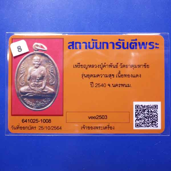 เหรียญหลวงปู่คำพันธ์ รุ่นอุดมความสุข วัดธาตุมหาชัย เนื้อทองแดง ปี 2540.....8.. (64.11.6