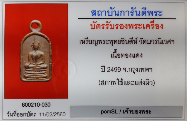 เหรียญพระพุทธชินสีห์ วัดบวร ปี2499 มาพร้อมบัตร G สบายใจครับ