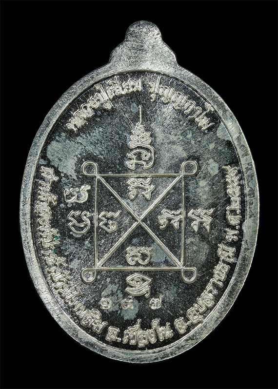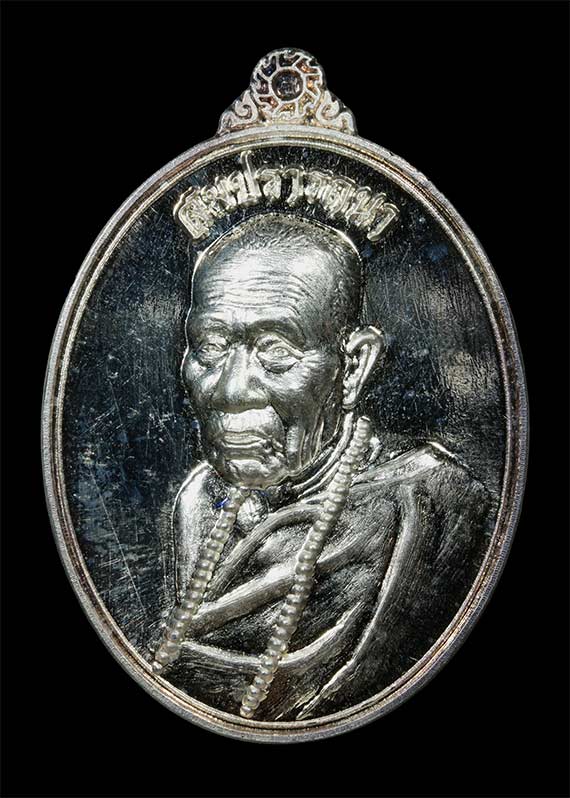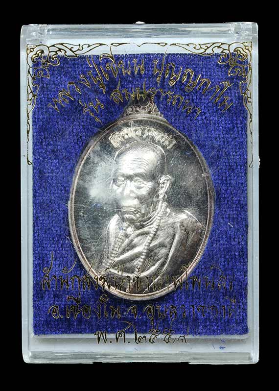 เหรียญหันข้างครึ่งองค์ รุ่น สมปรารถนา ( รุ่นแรก ) หลวงปู่เขียน ปุญญกาโม สำนักสงฆ์ป่าช้าบ้านโพนสิม จ.อุบลราชธานี พ.ศ.2559 เนื้อเงิน ตอกโค๊ต ตอกเลข สภาพเหรียญสวยพร้อมกล่อง