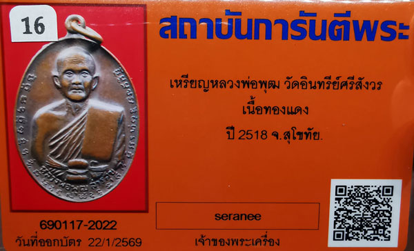 เหรียญหลวงพ่อพุฒ วัดอินทรีย์ศรีสังวร เนื้อทองแดง ห่วงเดิม ปี2518 จ.สุโขทัย + บัตรG-pra สภาพเดิมค่ะ