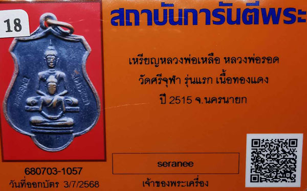 เหรียญหลวงพ่อเหลือ หลวงพ่อรอด วัดศรีจุฬา รุ่นแรก เนื้อทองแดง ห่วงเดิม ปี2515 จ.นครนายก + บัตรG-pra สภาพเดิมค่ะ