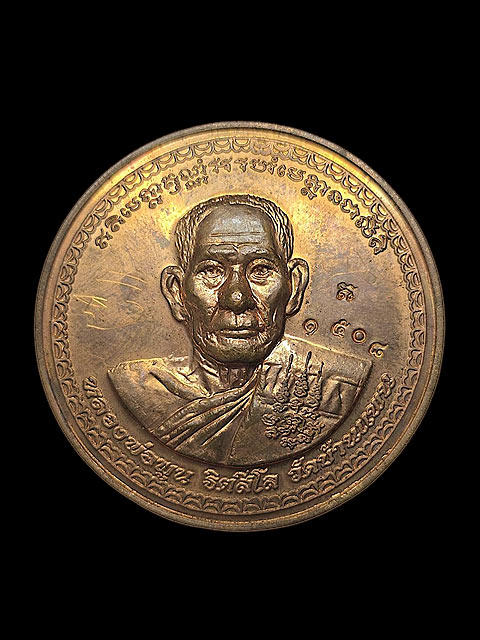 ***เหรียญบาตรน้ำมนต์ รุ่น "รวย เพิ่ม พูน" (เนื้อทองแดงผิวไฟ มีรอยจารมือ) 4. 2 ซม. พลวงพ่อพูน วัดบ้านแพน จ.อยุธยา***