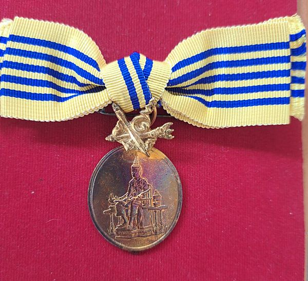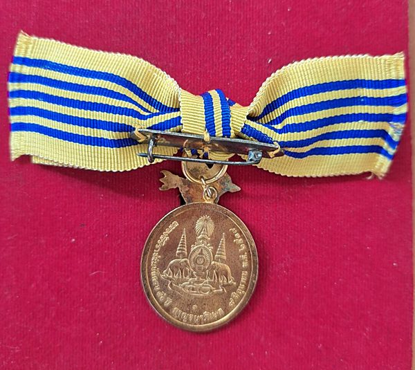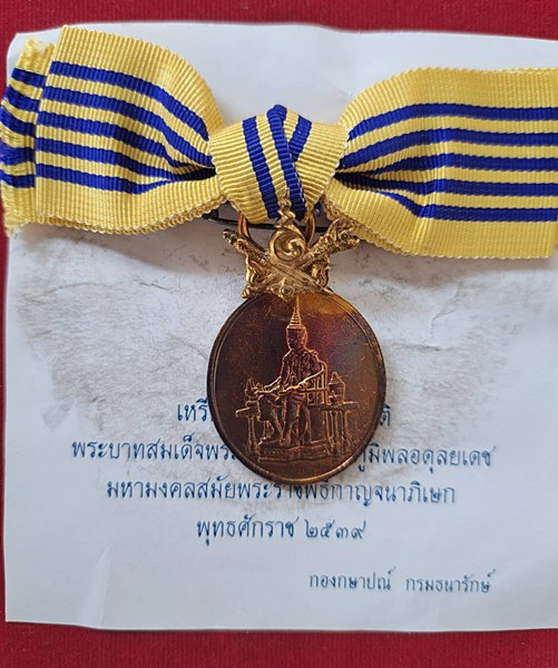 เหรียญที่ระลึกประดับแพรแถบ พระราชพิธีฉลองสิริราชสมบัติครบ 50 ปี ( กาญจนาภิเษก ) ปีพุทธศักราช 2539 เนื้อเงิน กะไหล่ทอง