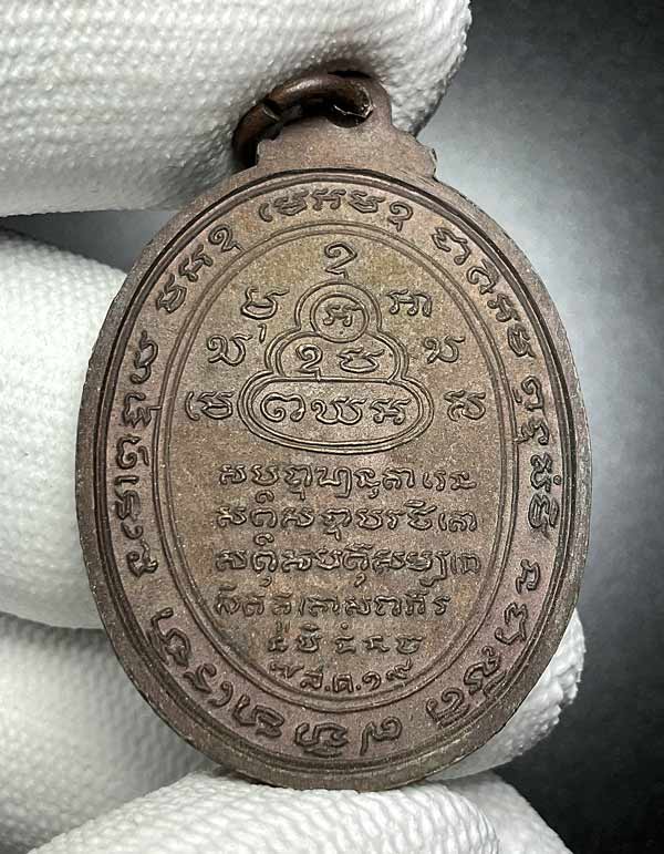 ด้านหลังของเหรียญ ตรงกลางเป็นยันต์น้ำเต้า ซึ่งเป็นอักขระยันต์สัญลักษณ์ของเจ้าคุณนรฯ วัดเทพศิรินทร์ ด้านล่างเป็นอักขระคาถาของหลวงพ่อคง วัดบางกะพ้อม จ.สมุทรสงคราม ซึ่งปรากฏอยู่บนเหรียญรุ่นแรกของท่าน สำหรับอักขระคาถารอบเหรียญ เป็นของหลวงพ่อแดง วัดเขาบันไดอิฐ จ.เพชรบุรี ซึ่งปรากฏอยู่ด้านหลังเหรียญรุ่นแรกของท่านเช่นเดียวกัน