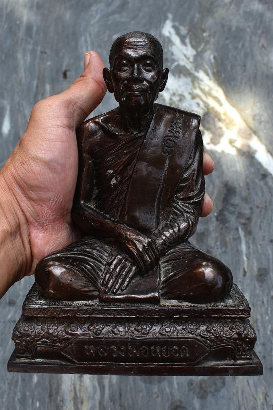 พระรูปเหมือนขนาดบูชา หลวงพ่อหยอด วัดแก้วเจริญ จ.สมุทรสงคราม เนื้อโลหะ ใต้ฐานอุดผงว่านฝังพระ พระบ้าน ผิวหิ้ง สภาพพระตามรูปที่ลงทุกประการ