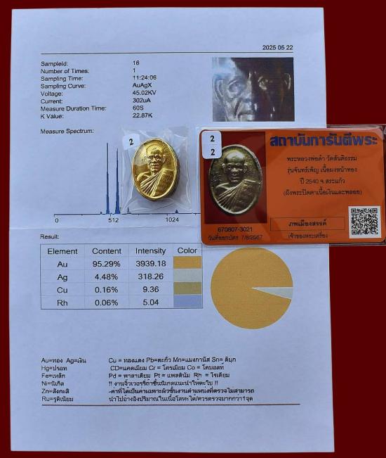 แผ่นทองคำด้านหน้า วัดเปอร์เซ็นทองได้ G 95.29 %