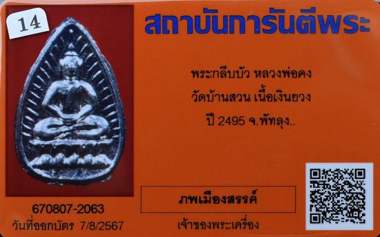 พระกลีบบัว เนื้อเงินยวง ปี 2495 หลวงพ่อคง วัดบ้านสวน จ.พัทลุง มาพร้อมบัตรรับรองพระแท้การันตีพระ สภาพพระตามรูปที่ลงทุกประการ