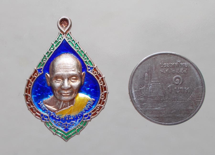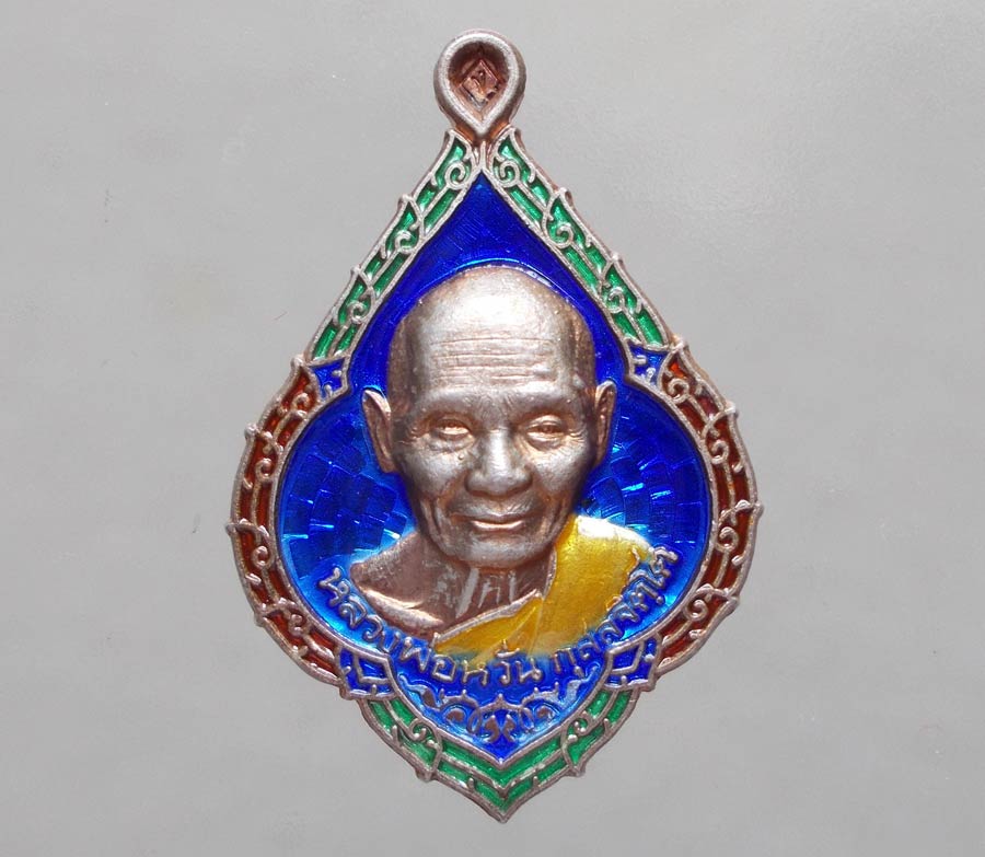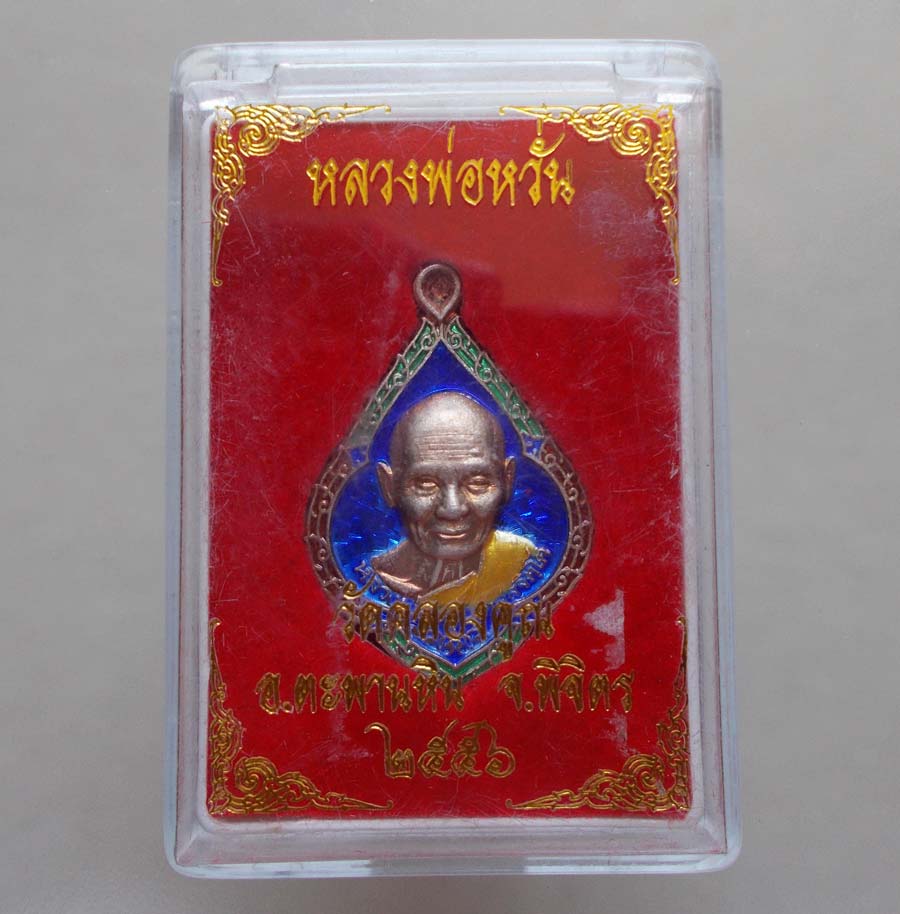 เหรียญใบสาเก หลวงพ่อหวั่น กุศลจิตฺโต วัดคลองคูณ พ.ศ.2556 เนื้อเงินลงยา 4 สี ( พึ้นสีน้ำเงิน ) ตอก 2 โค๊ต ตอกเลข กล่องครบ !!