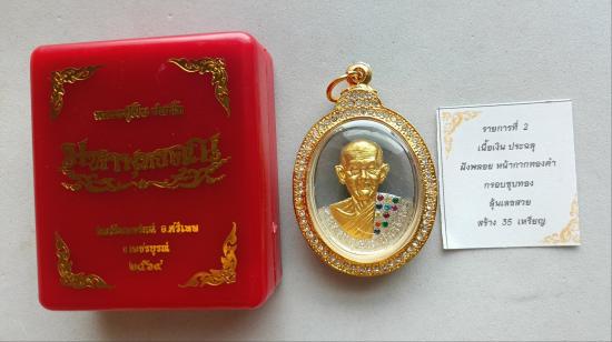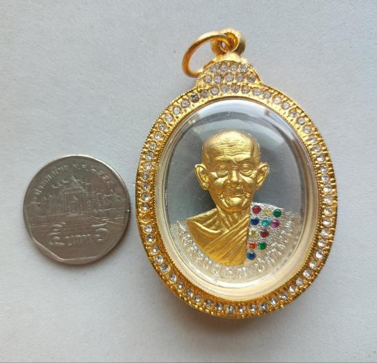 วัดใจเคาะเดียวแดงจ้า เหรียญหลวงปู่ฝั้น วัดศรีถมอรัตน์ เนื้อเงินฉลุหน้ากากทองคำฝังพลอยนพเกล้า เลข4 เคาะเดียวแดงจ้า