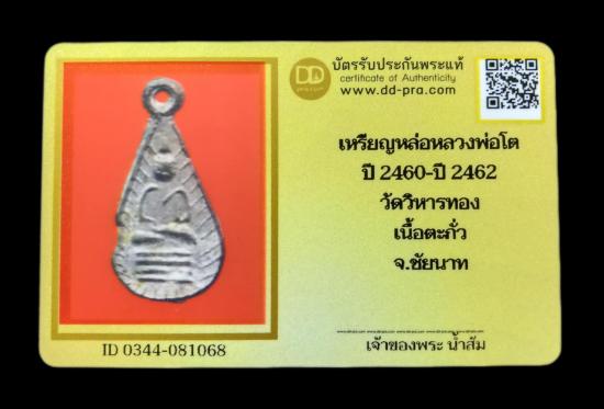 เหรียญหลวงพ่อโต วัดวิหารทอง พิมพ์ หยดน้ำ เนื้อชินตะกั่ว ปี พ.ศ.๒๔๖๐-๒๔๖๒ (หลวงปู่ศุข ปลุกเสก) (พร้อมบัตรรับรอง)