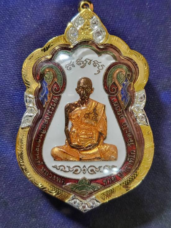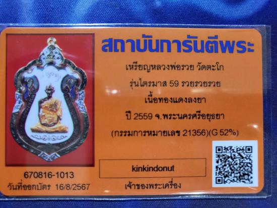 เหรียญหลวงพ่อรวย วัดตะโก รุ่นไตรมาส 59 รวยรวยรวย เนื้อทองแดงลงยา (กรรมการ) ปี 2559 จ.พระนครศรีอยุธยา หมายเลข 21356 เลี่ยมกรอบทองคำแท้ พร้อมบัตรรับรองสถาบันการันตีพระ รับประกันตามกฎ G พระ ทุกประการ