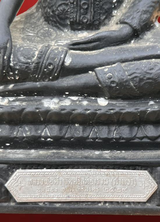พระบูชาหลวงพ่อดำ ปางมารวิชัยทรงเครื่องจีวรลายดอก หน้าตัก 5 นิ้ว วัดศรีสุทธาราม สมุทรสาคร ปี29 ผิวหิ้งเดิมๆ สวย ฐาน 12 นักษัตริ์