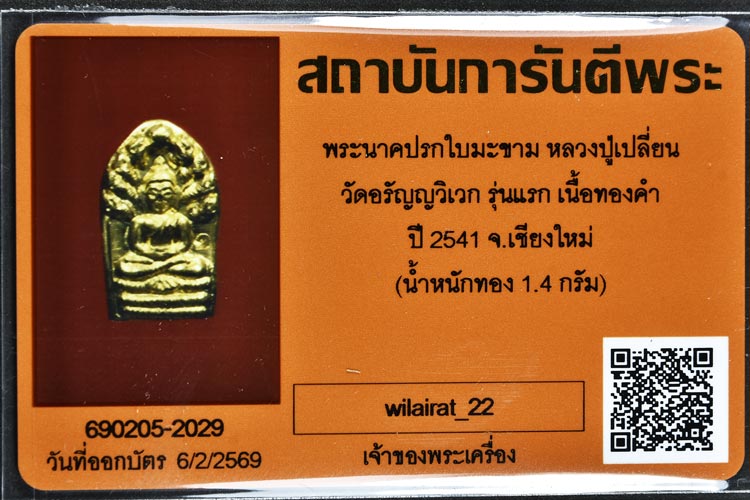 "เนื้อทองคำ" พระนาคปรกมะขาม อาจารย์เปลี่ยน วัดอรัญญวิเวก รุ่นแรก ปี41 "น้ำหนัก 1.4กรัม" พร้อมบัตรรับรอง