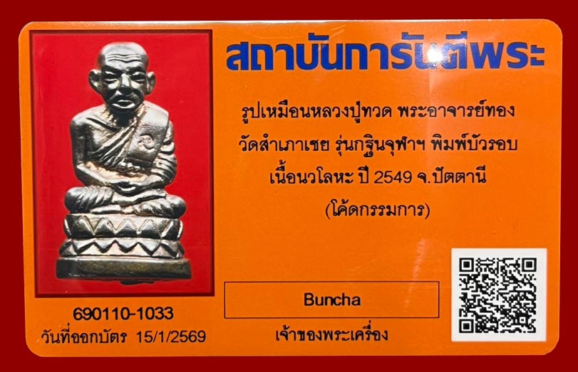 หลวงปู่ทวด พิมพ์บัวรอบ พระอาจารย์ทอง วัดสำเภาเชย จ.ปัตตานี รุ่นกฐินจุฬาฯ เนื้อนวะโลหะ โค๊ตกรรมการ อุดทองคำ สร้างน้อย หายาก สภาพสวย พร้อมบัตรรับรองครับ. |