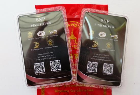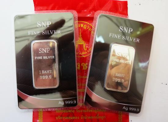 เงินแท่งขนาด 1 บาท หรือ FINE SILVER 999.9% น้ำหนัก 15.2 กรัมต่อ 1 แท่ง กะทู้นี้เคาะทีเดียวได้ 2 แท่งครับ |