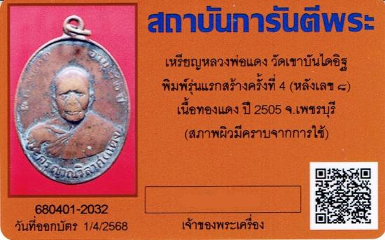 เหรียญหลวงพ่อแดง รุ่น 2 บล็อก8ใหญ่ หัวจุก พร้อมบัตรรับรอง2สถาบัน