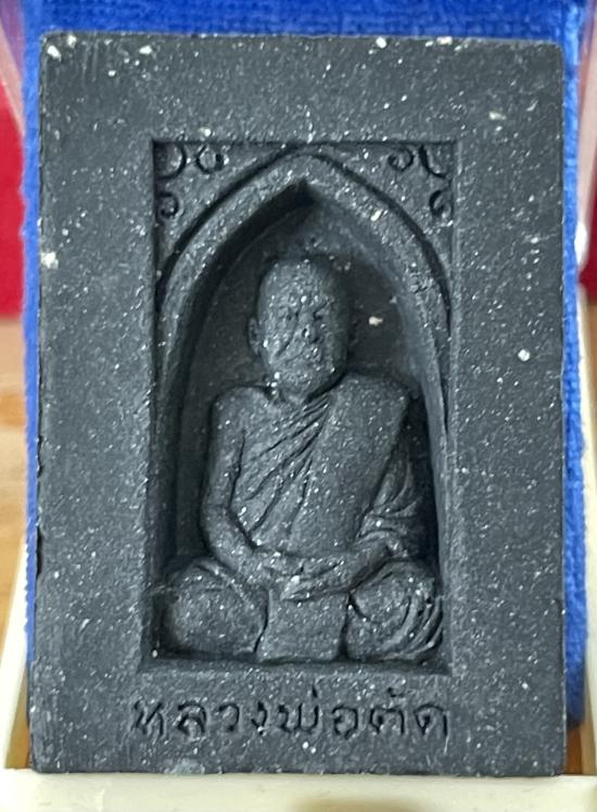 พระเนื้อผงว่านรูปเหมือน รุ่นเลื่อนสมณศักดิ์ เนื้อว่านกลักไม้ขีด หลังฝังเหรียญเม็ดแตง ตอกโคตและหมายเลข ๓๗๔๙ หลวงพ่อตัด ปวโร วัดชายนา จ.เพชรบุรี สร้างปี 2551 พร้อมกล่อง