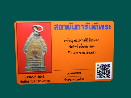 เหรียญพระพุทธศิริชัยมงคล วัดโพธิ์บางคล้า ฉะเชิงเทรา ปี 2481 ห่วงเชื่อมเดิม.....หลวงพ่อดิ่ง ปลุกเสก...พร้อมบัตรรับรอง....รับประกันตามกฎ G-pra ครับ