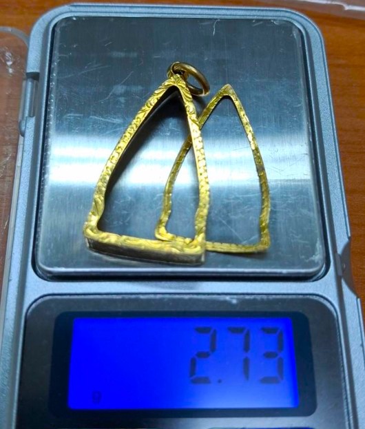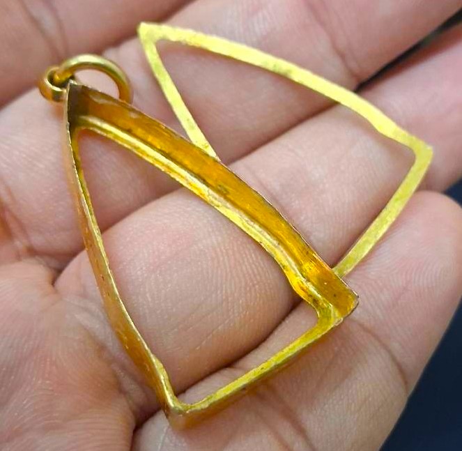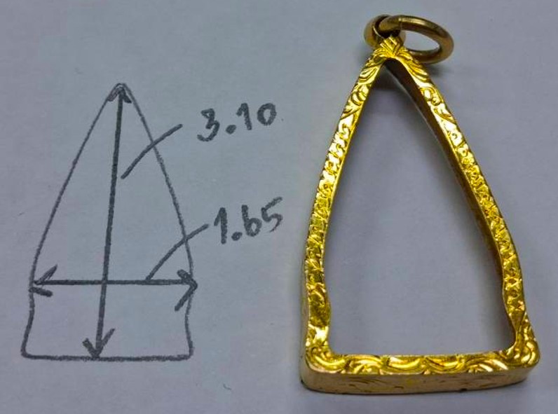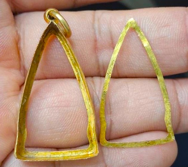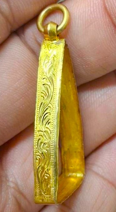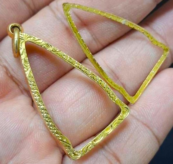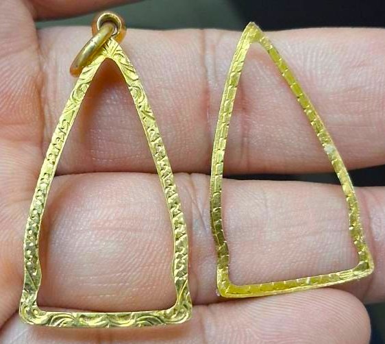 กรอบทองมือสอง ใส่เหรียญหลวงพ่อโสธร 2 หน้า หรืออื่นๆที่ไกล้เคียง หน้าจอกว้าง 1.65 ซม., สูง 3.10 ซม. น้ำหนัก 2.73 กรัม เคาะเดียว