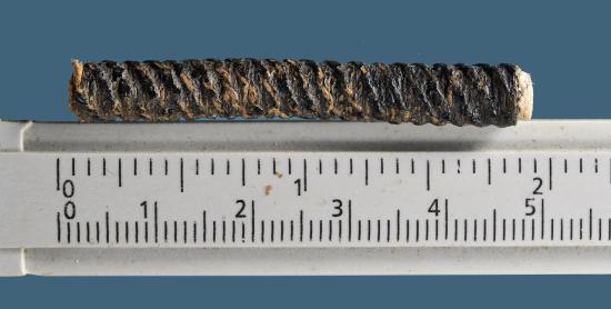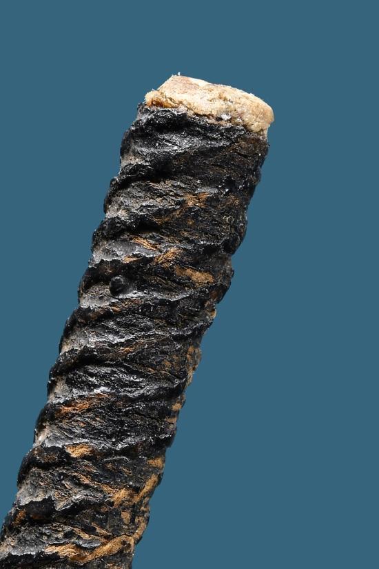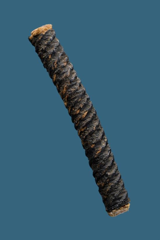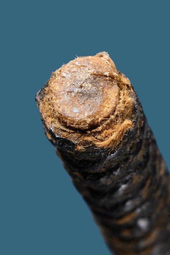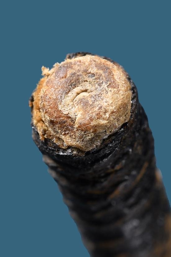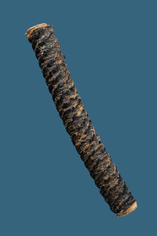 ตะกรุดสาริกา หนังหน้าผากเสือถักเชือกลงรักเก่า อายุร้อยปี ไม่ทราบที่ ขนาดความยาว 2 นิ้ว