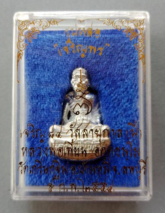 รูปหล่อเจริญพร(ก้นถ้วย)เนื้อเงิน หลวงพ่อเพี้ยน วัดเกริ่นกฐิน จ.ลพบุรี ปี2554 หมายเลข2679 พร้อมกล่อง ตามรูป