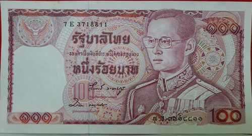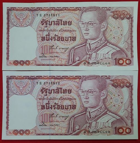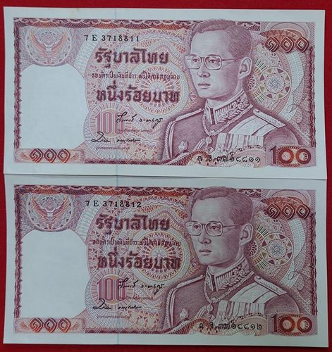 ธนบัตร 100 บาท ในหลวงรัชกาลที่ 9 แบบ 12 รุ่น2 ด้านหลังช้างแดง เลขเรียง จำนวน 4 ฉบับ สภาพ UNC สวย,ใหม่,ไม่ได้ใช้,ไม่มีรอยพับ ลายเซ็นหายากมาก พิมพ์น้อย วีรพงษ์ รามางกูร-ชวลิต ธนะชานันท์ ราคาประเมิน แพงสุดในรุ่นนี้ หมายเลข 7E 3718811 และ 7E 3718812